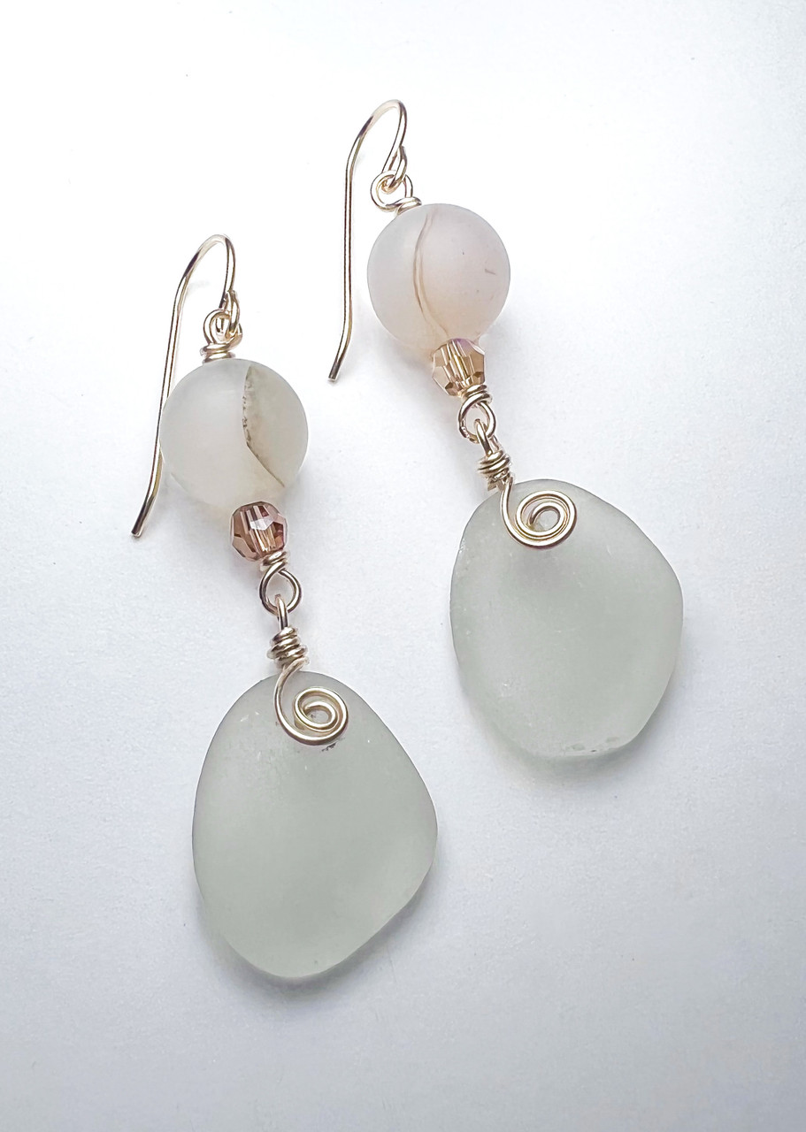 Genuine white sea glass hung with chalcedony and crystal beads on 14k gold filled ear wires. The total drop length is 2 inches.