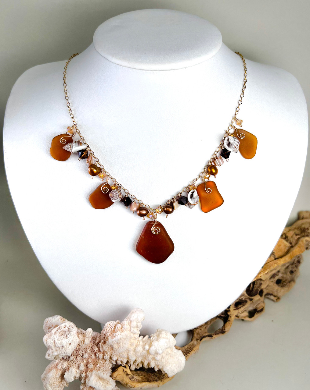 Amber sea glass hung with shell, freshwater pearls and Swarovski crystals on 14k gold filled chain. The length is 17 inches.