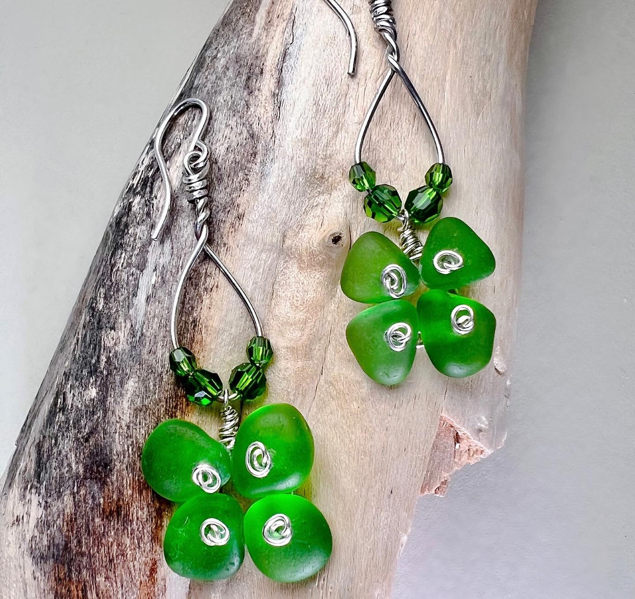 Very cute and festive, these sea glass clover earrings can be worn for St. Patty's Day or whenever you're feeling lucky! The length is 2 inches from the ear wire and the clovers are 1/2 inch wide.