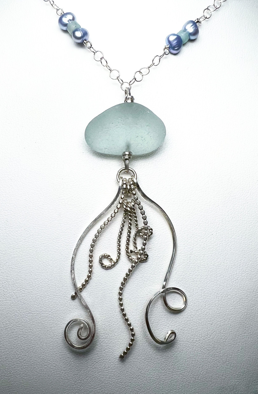 Loading... Please wait...Genuine light ice blue sea glass jellyfish with hammered sterling tentacles hung on a sterling chain with freshwater pearls and amazonite Heishi beads. The sea glass is 1x.75 inches and the drop of the total pendant is 3.25 inches. The length of the necklace is 16 inches. An extension can be added if needed.