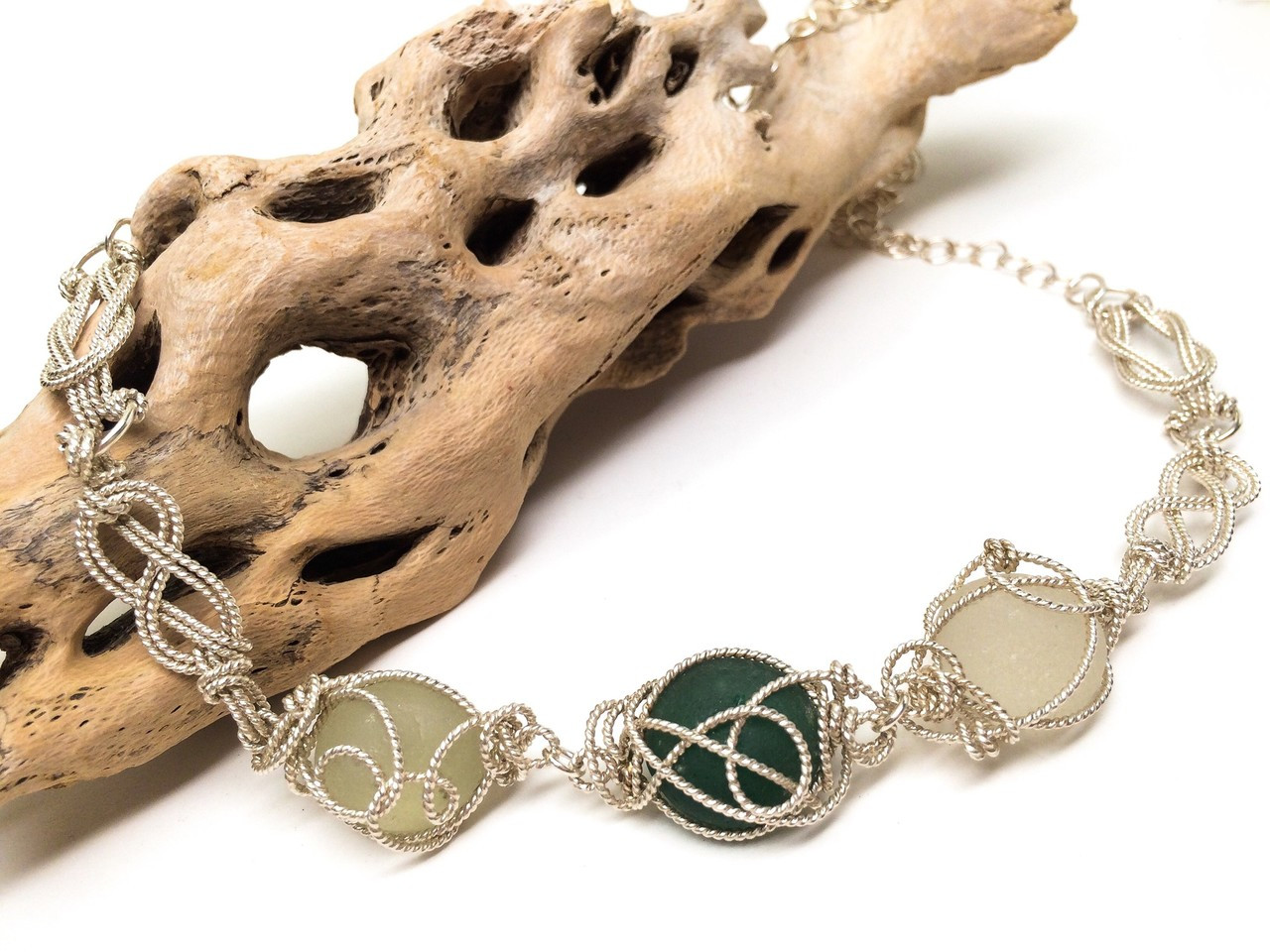 Loading... Please wait...Three rare almost perfectly round sea glass nuggets wrapped in sterling rope wire to resemble tangled buoys. The same wire was used to make nautical knot links along the neckline. The sea glass is white, deep teal and yellow tinged. The length of this necklace is 20 inches.
