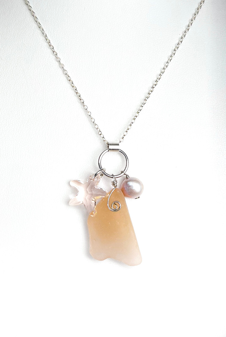 Rare peachy pink sea glass hung with a Swarovski star fish and fresh water pearl on sterling chain. The length of the necklace is 17.5 inches.