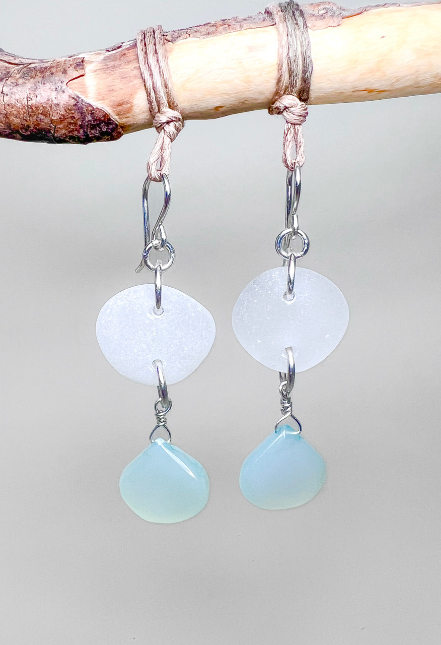 Genuine frosty white sea glass and mint chalcedony dangle earrings. Sterling ear wires. Length 2 inches.